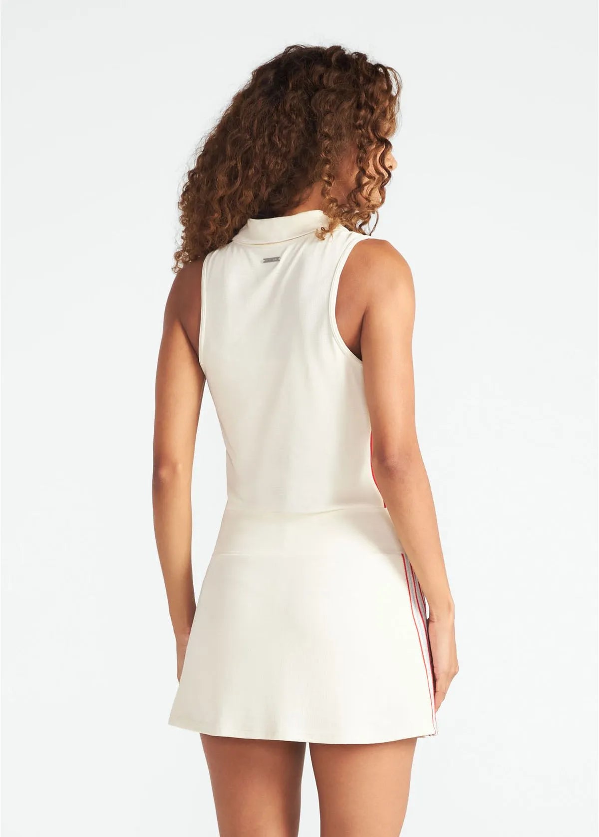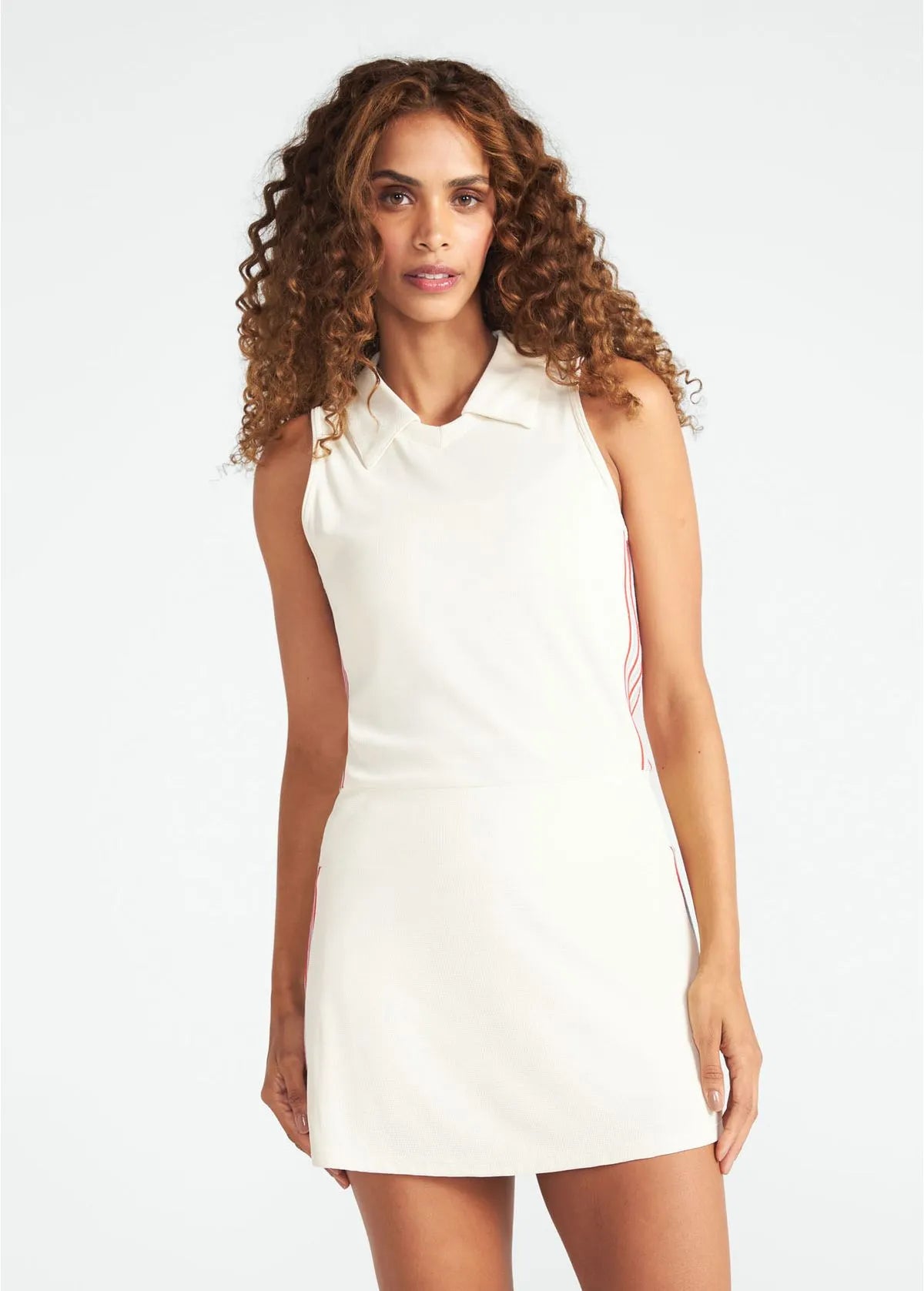 O Vestido Sunset une elegância e funcionalidade em uma única peça. Feito em piquet na cor Sal, sua modelagem levemente ajustada até o cós e evasê depois, garante conforto e liberdade de movimento. A bermuda interna de compressão moderada com bolsos laterais e silicone na barra proporciona praticidade durante a atividade física. O toque diferenciado fica nas aplicações de tricô nas cores Sal, Azul Claro e Vermelho, nas laterais da peça.